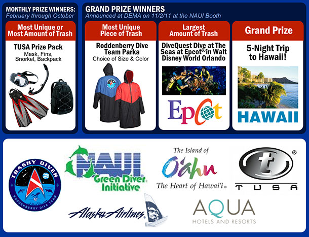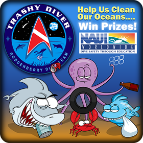 | The Roddenberry Dive Team in partnership with the NAUI Green Diver Initiative, the Oahu Visitors Bureau and TUSA present the Trashy Diver Contest! We are challenging all ocean enthusiasts, scuba divers, beach combers and water lovers alike to collect trash from any water or coastal marine environment and photograph the results! You could win one of our great monthly prizes as well as chance to win the Grand Prize, a 5-night trip to Hawaii! | ![]() |