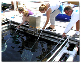 Help clean sea-life off of our white seabass pens so that the fish will always have a constant flow of fresh water! Dive with a purpose and help pick, pull and pry sea life off the nets! Fill out a Volunteer Application to be notified of scheduled cleaning dives.